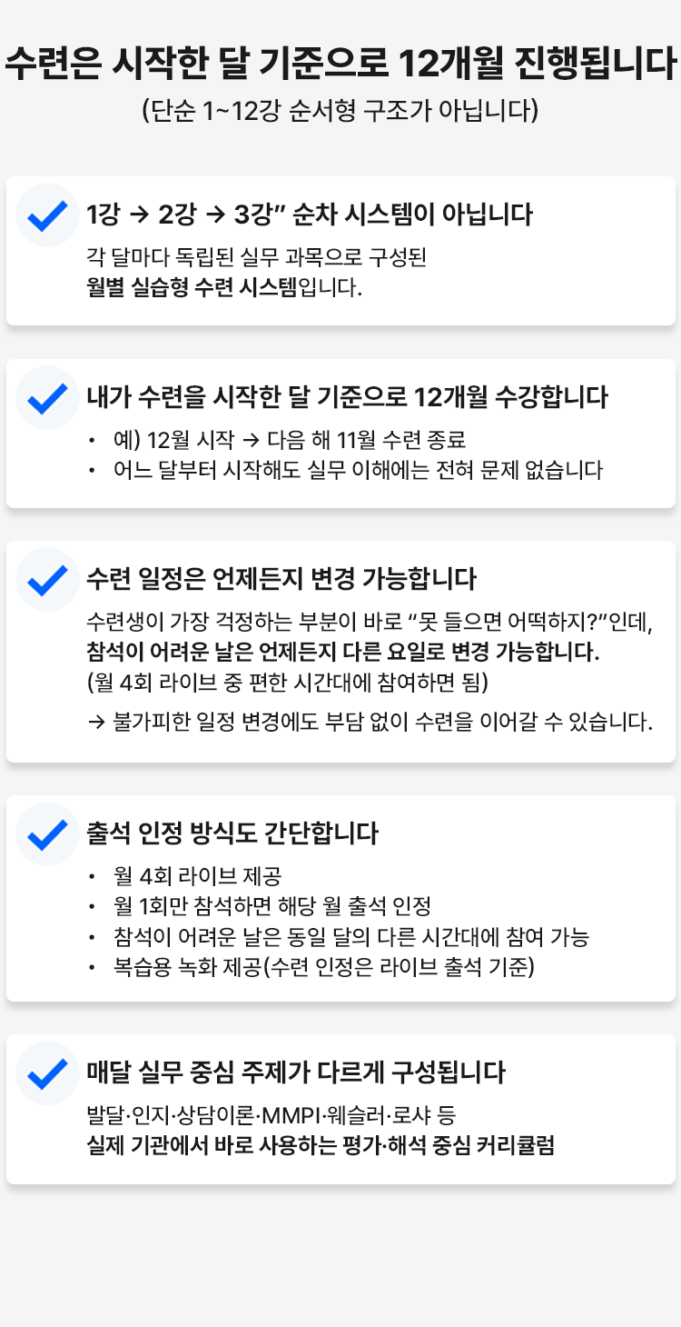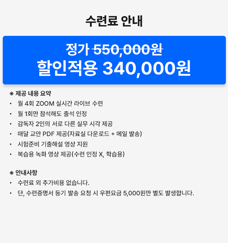 (녹화된 내강의실 1년치 24개 동영상 제공은 단순 예습,복습용으로 사용되며 녹화된 영상 을 통한 수련은 산업인력공단의 규정에 따라 인정 불가 합니다.)